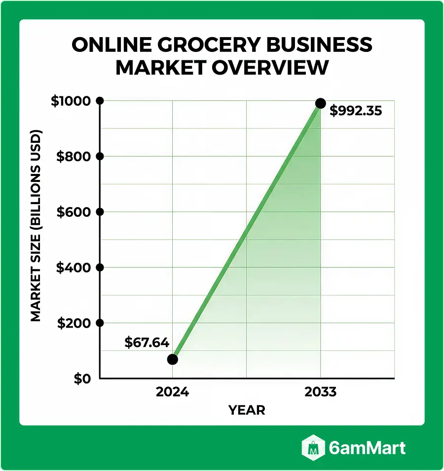 The global online grocery market is expanding at an explosive pace. In 2024, it was valued at around USD 67.64 billion, and by 2033, it’s expected to skyrocket to nearly USD 1 trillion (USD 992.35 billion).